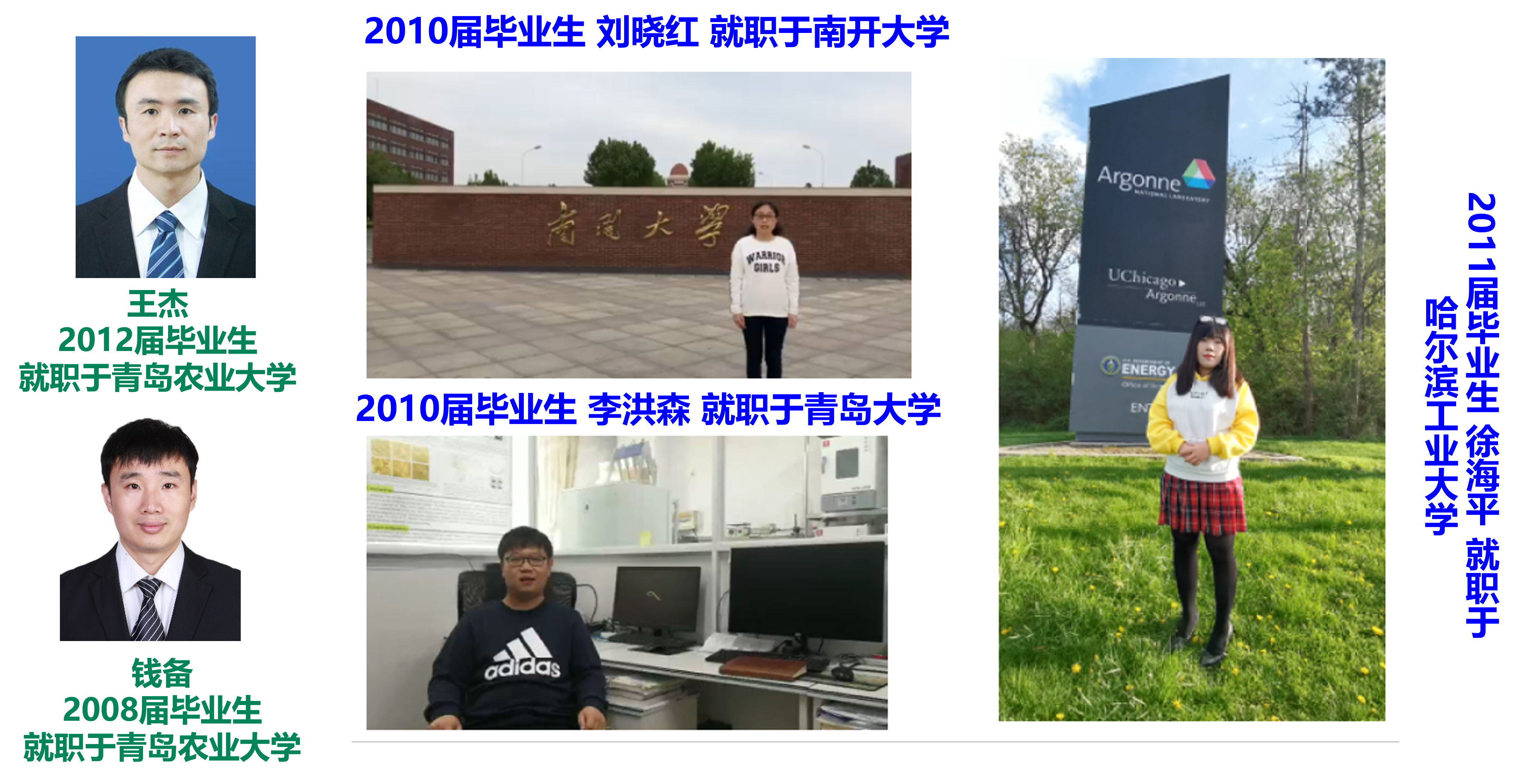 优秀校友:2010届毕业生刘晓红,曾获省级优秀毕业本科论文,现就职于南开大学。2010 届毕业生 ,曾获省优秀毕业本科论文,现就职于青岛大学。2011届毕业生徐海平,美国阿贡国家实验室博士后,目前就职于哈尔滨工业大学。