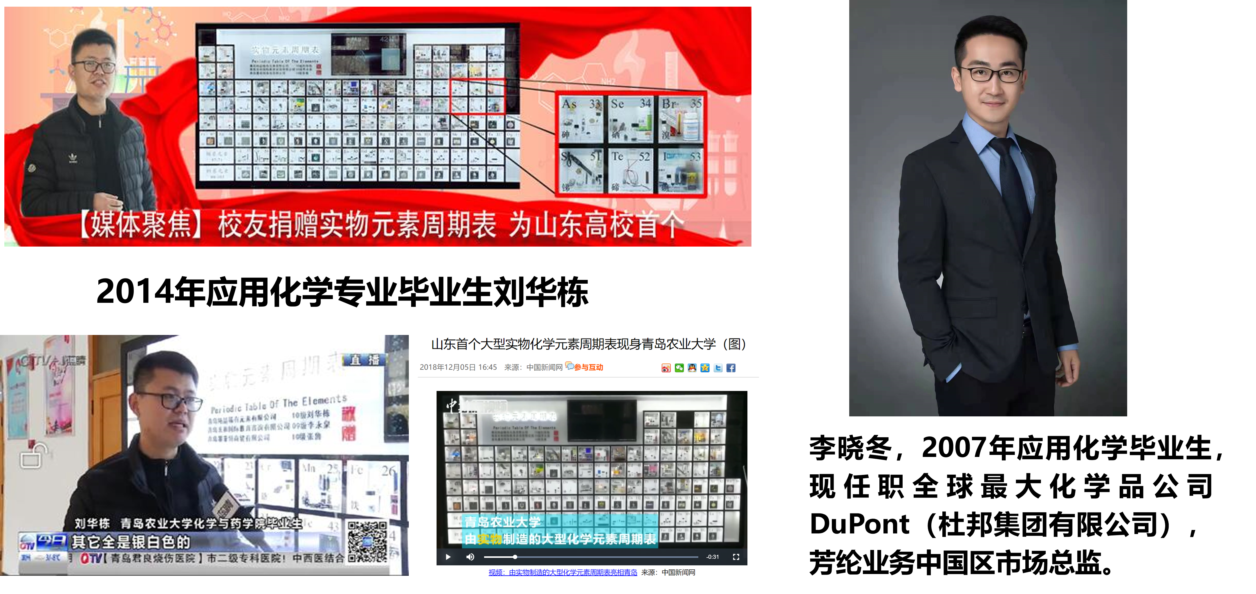 2014届应化专业毕业生刘华栋,毕业后凭借较强的专业功底开始了自主创业,目前已注册成立青岛纯晶稀有元素有限公司,从事于稀有元素的制备,客户包括科普馆、博物馆、大学实验室、研究所等。我院十周年院庆,他无偿捐赠实物元素周期表为山东省首个大型实物化学元素周期表,曾获得媒体的广泛关注和报道。李晓冬,太阳成tyc122cc集团应用化学专业2007届毕业生,现任职于全球最大化学品公司DuPont(杜邦集团有限公司),芳纶业务中国区市场总监。