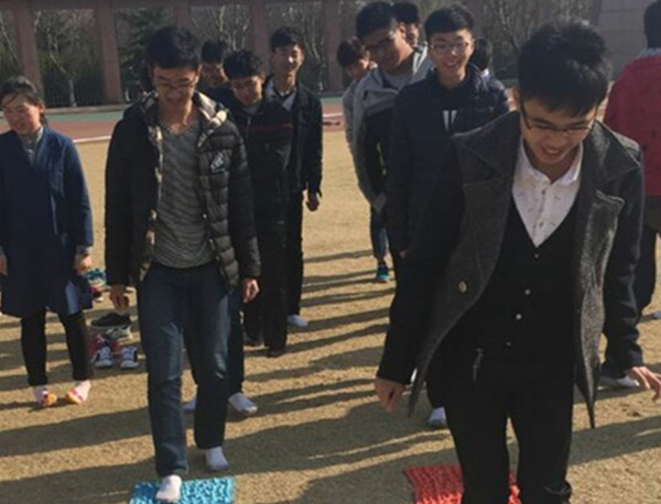 指压板挑战中,同学们共分为两队同时进行比赛。比赛中,团队成员之间配合默契,团结一致,充分展现出了班级成员间的风采与魅力。面对踩在指压板上的痛苦,同学们还是不停歇地完成了挑战。