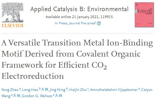 课题组和伍伦贡大学赵勇博士、王彩云教授、Gordon Wallace教授在Applied Catalysis B:Environmental 发表文章:COF源氮掺杂碳锚定过渡金属离子用于高效CO2电化学还原