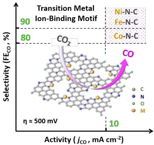 将过渡金属离子直接锚定到分子结构可控的有机多孔材料(如共价有机网络、氮化碳、氧化石墨烯等)是一种制备高选择性M-N-C催化剂的有效方法。然而,报道的这类催化剂的电活性(即CO表观电流密度)仍极大地受到基底材料导电性差的限制;而且,目前对这种异相基体上的金属离子配位用于CO2电还原反应仍缺乏系统的研究。探索有效的方法以协调金属中心物种、配位环境、基底导电性这三种因素并系统研究决定金属中心活性的基底结构因素,是制备高选择性、高活性M-N-C型CO2还原催化剂的关键。