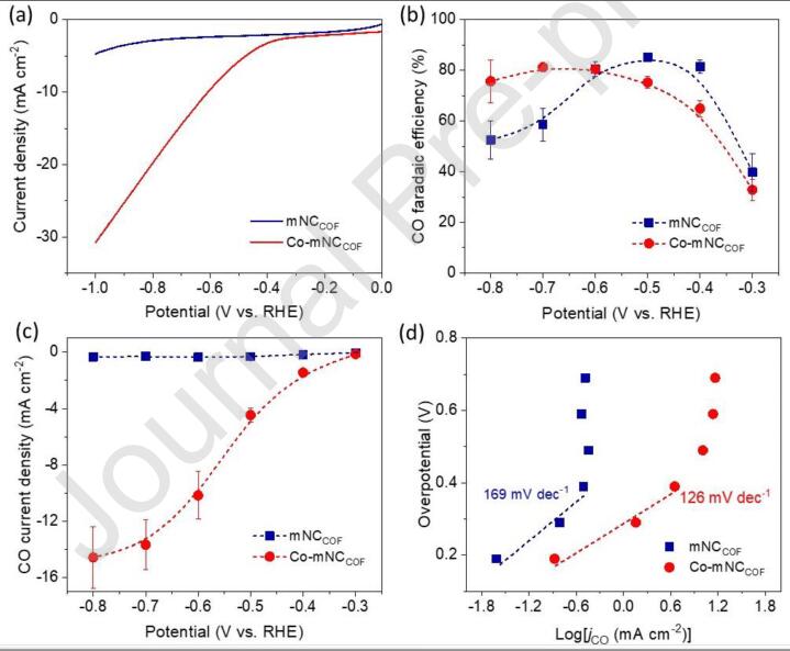 图3. Co-mNCCOF及mNCCOF催化剂在0.5M KHCO3溶液中的CO2电催化还原性能。(a)线性扫描曲线对比,(b)CO选择性对比,(c)CO分电流对比,(d)Tafel曲线对比。