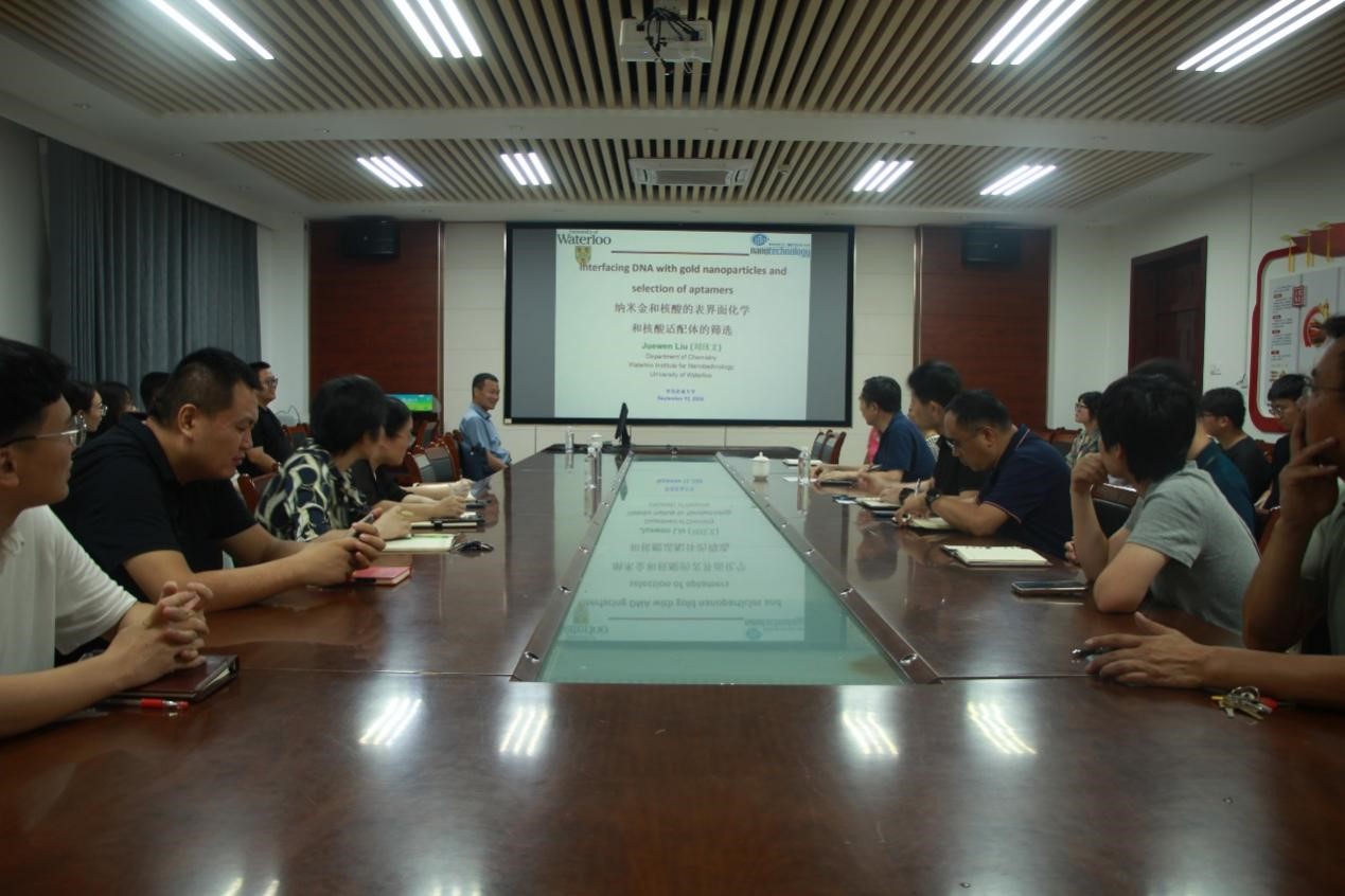 9月12日,太阳成集团tyc122ccvip“化学+”学术论坛邀请刘钰文教授作 “关于纳米金和核酸的表界面化学及核酸适配体筛选”的专题报告。本次讲座于化学楼207会议室开展,由加拿大滑铁卢大学化学系教授、博士生导师刘珏文主讲,学院教师代表和研究生参加。