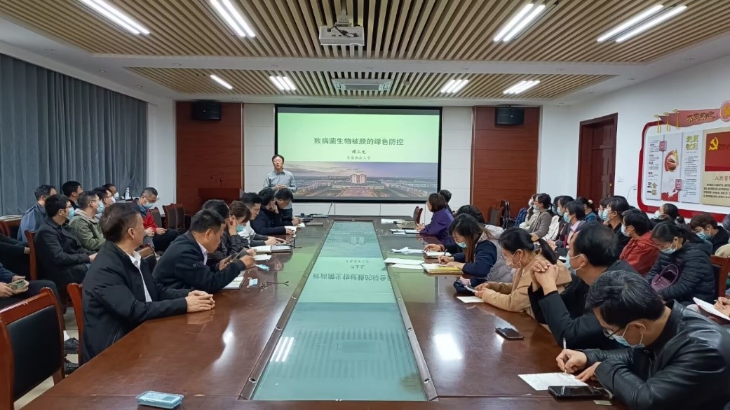 会上,谭玉龙以《致病菌生物被膜的绿色防控》为题,结合自身的研究经历,从研究背景、研究问题及研究成果等方面做了讲解。谭玉龙表示,目前生物被膜研究已经取得了一定的研究成果:一是揭示了生物规模的耐药机制,研究发现胞外多糖是提高内部菌体耐药性的重要因素,为设计新的防控策略提供了关键靶点;二是开发了绿色的抗生物被膜策略,通过双靶向菌体与胞外基质,实现了协同作用效果,为探索新型抗生物被膜方案,提供了新颖的思路与坚实的理论基础。讲座结束后,谭玉龙还与参加讲座的教师进行了互动交流,回答了相关问题。