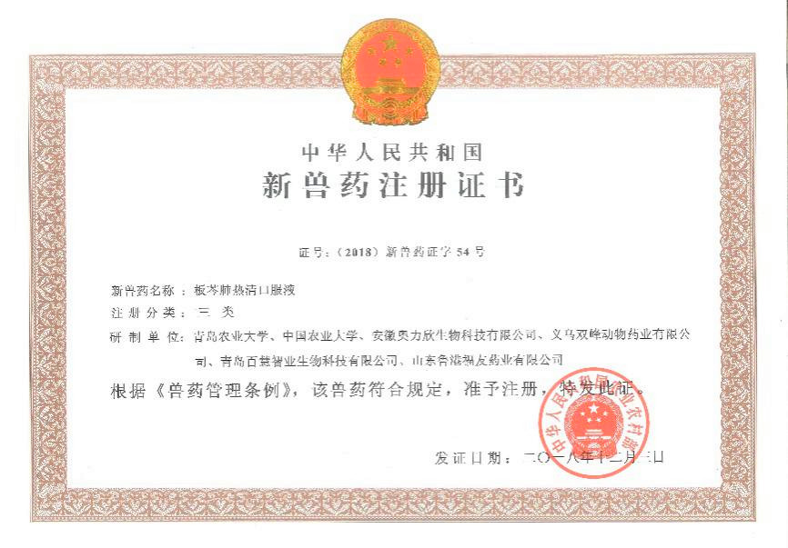 近期,太阳成集团tyc122ccvip郝智慧教授团队在新兽药研制方面的研究又添新成果。农业农村部发布第94号公告发布了太阳成tyc122cc集团主持首位完成的研究成果“板芩肺热清口服液”获批国家三类新兽药并成功转化,该新药监测期3年,公告并发布产品质量标准、说明书和标签。