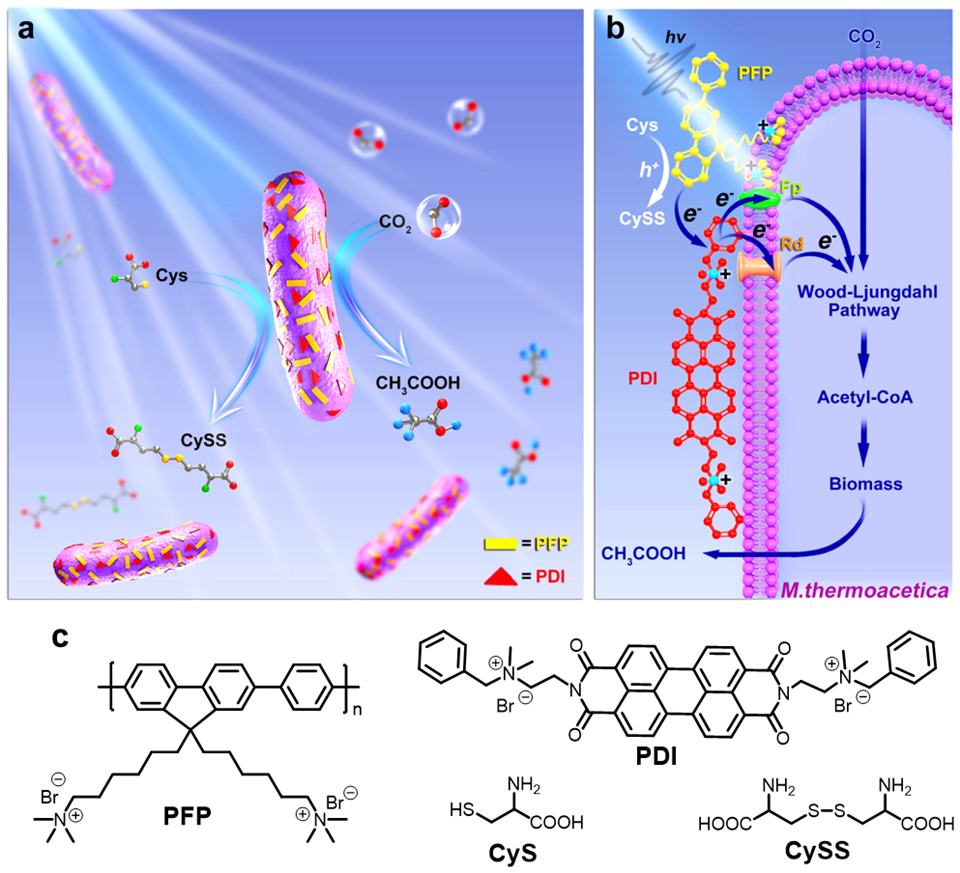 大气中二氧化碳的含量猛增是导致全球温室效应的重要原因,如何实现高效率的人工光合作用以应对严峻的能源和环境问题是目前研究的一大热点。本研究工作构建了有机半导体-非光合细菌的生物杂化光合成系统,如图所示,作为光敏剂的离子型有机半导体材料可嵌入细菌M. thermoacetica膜内,利于光生电子从光敏共轭分子高效转移到细菌内部,实现了CO2到乙酸的还原,其转化效率高达1.6 %,可媲美于已报道的植物或藻类及无机生物杂交系统的效率。更为重要的是,光转换性能可通过优化有机半导体材料进一步提高。该工作开辟了有机半导体应用于生物能源的新途径,同时为实现CO2固定提供了简便的生物制造方法。