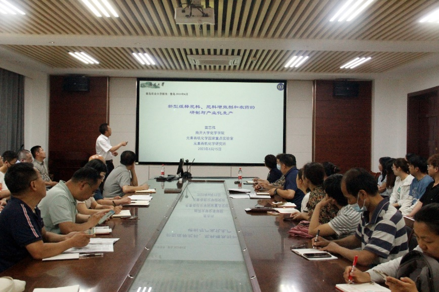 苗志伟教授依据我校特点从农业领域以《新型缓释肥料及农药新合成工艺发展开发与应用》为题讲座,分别从项目研发背景、国家重点研发计划专项目标、现代农业设施灌溉模式、农户对水溶性肥料的需求等多个方面进行讲解。苗志伟教授对多聚磷酸胺水溶肥的研制过程、制备、生产技术、检测方法做了重点汇报,并表示目前该研究项目已申请国家专利,同时与山东泰宝生物科技有限公司实现了科技成果转化与项目推广。
