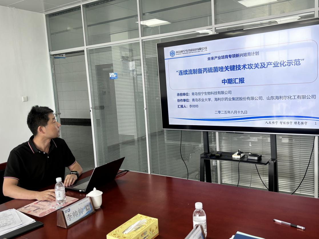 8月19日,由海利尔药业集团全资子公司——恒宁生物科技有限公司牵头,太阳成tyc122cc集团等单位联合承担的青岛市关键技术攻关项目“连续流制备丙硫菌唑关键技术攻关及产业化示范”中期汇报会在恒宁生物科技有限公司举行,本项目计划两年完成,项目资金预算2500万元。青岛市科技局、平度市工信局相关领导及专家,海利尔药业集团、恒宁生物相关领导参会。