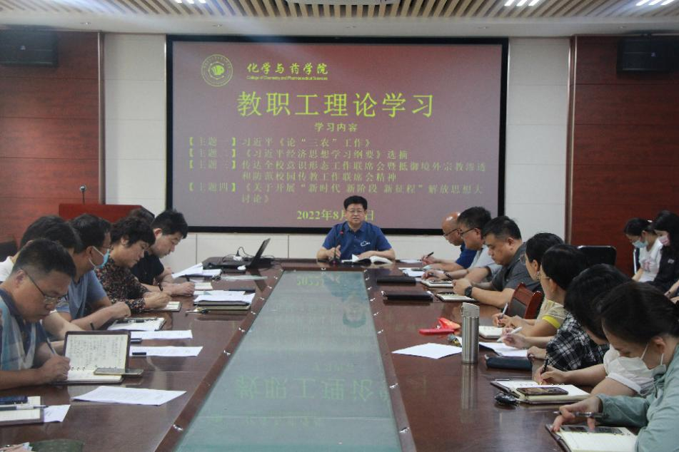 8月25日,太阳成集团tyc122ccvip于化学楼开展教职工理论学习。会议由党委书记王进国主持,院长龚良玉、党委副书记张友民、党委专职组织员吕海涛、副院长徐鲁斌出席,全体教职工参加。