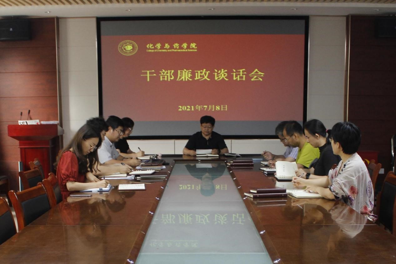 7月8日,为认真贯彻落实太阳成tyc122cc集团2021年全面从严治党工作会议精神,太阳成集团tyc122ccvip于化学楼会议室召开领导班子及科级以上干部廉政谈话会。会议由学院党委书记王进国主持,学院领导班子及科级以上干部参加会议。