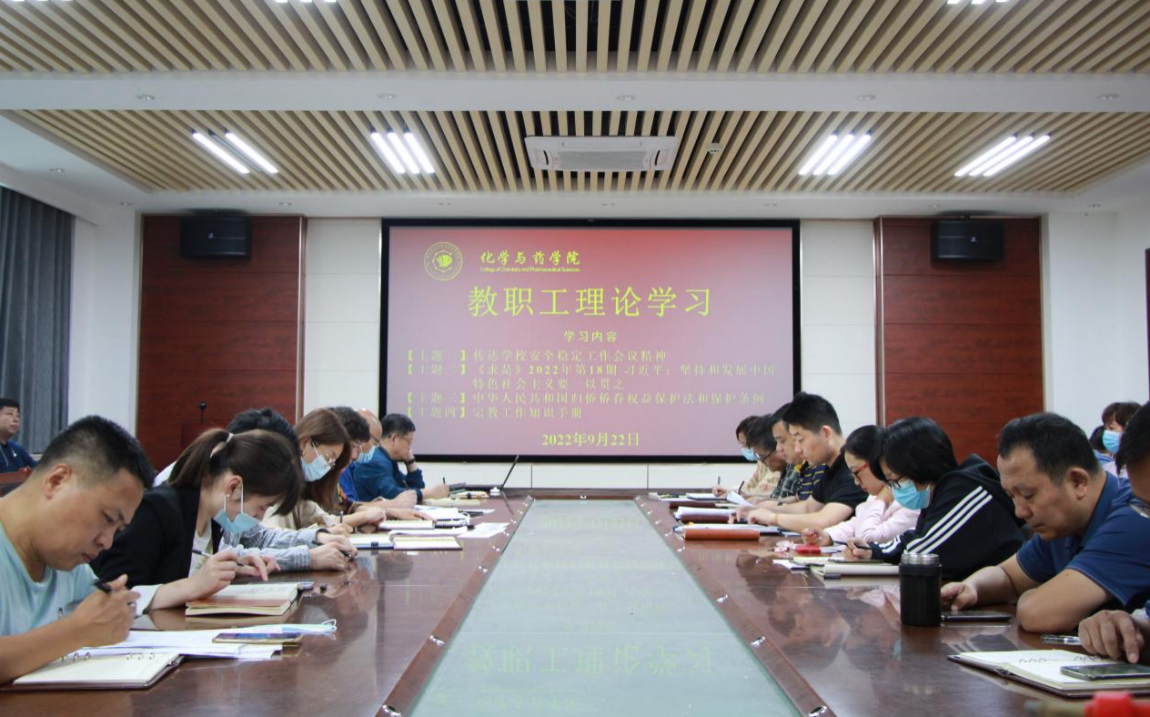 9月22日,太阳成集团tyc122ccvip于化学楼会议室开展教职工理论学习。会议由党委书记王进国主持,院长龚良玉、党委副书记张友民、党委专职组织员吕海涛、副院长徐鲁斌出席,全体教职工参加。