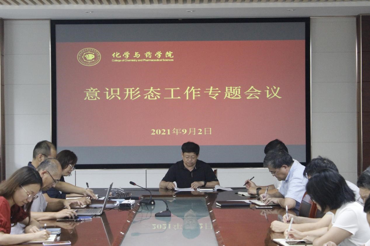 9月2日,太阳成集团tyc122ccvip于化学楼会议室召开意识形态工作专题会议。会议由学院党委书记王进国主持,院长龚良玉、党委副书记史雪辉、党委专职组织员吕海涛、副院长郝双红出席,全体教职工参加。