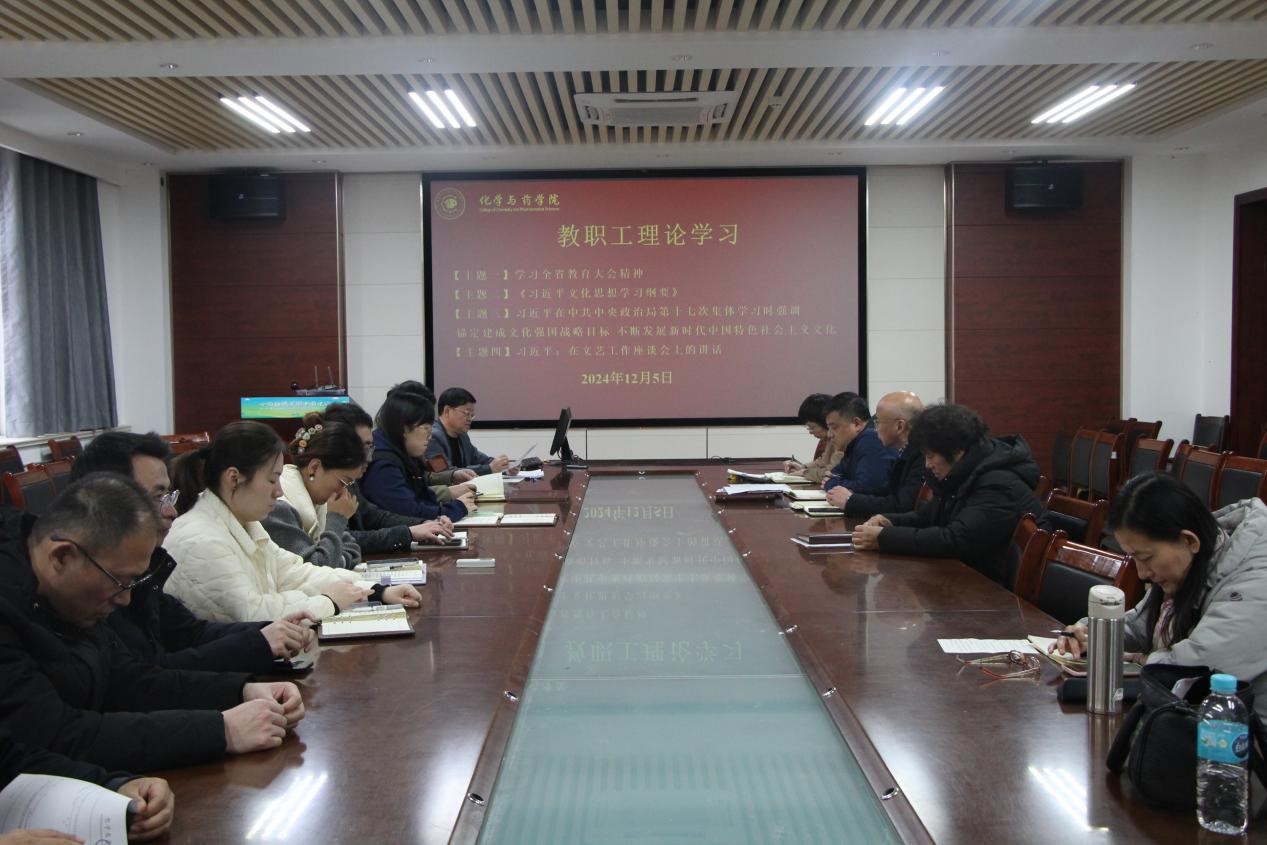 12月5日,太阳成集团tyc122ccvip于化学楼207会议室开展教职工理论学习,会议由学院党委书记王进国主持,全体教职工参与,深入学习全省教育大会精神及习近平文化思想。