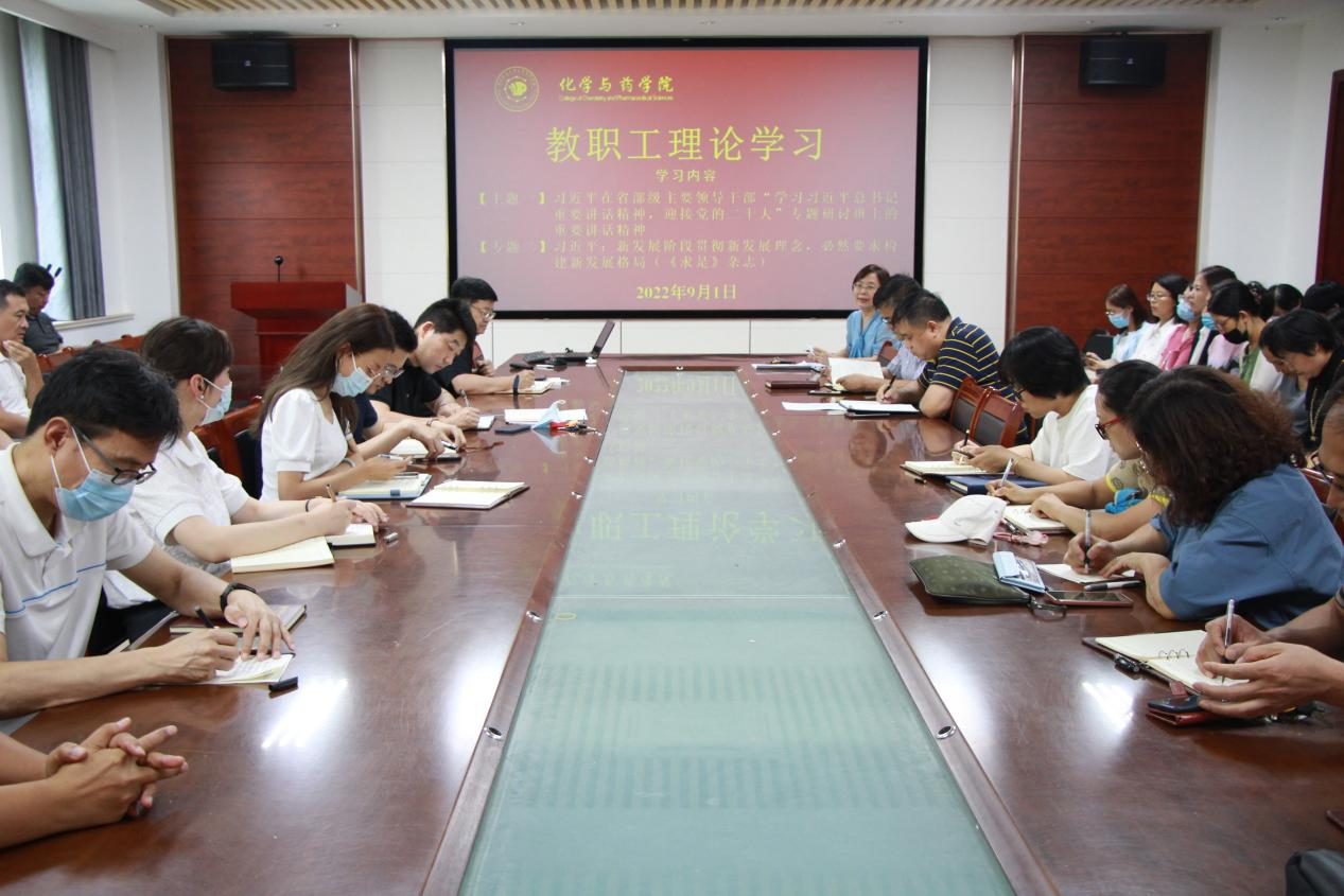 9月1日,太阳成集团tyc122ccvip于化学楼开展教职工理论学习。会议由党委书记王进国主持,院长龚良玉、党委专职组织员吕海涛、副院长徐鲁斌出席,全体教职工参加。