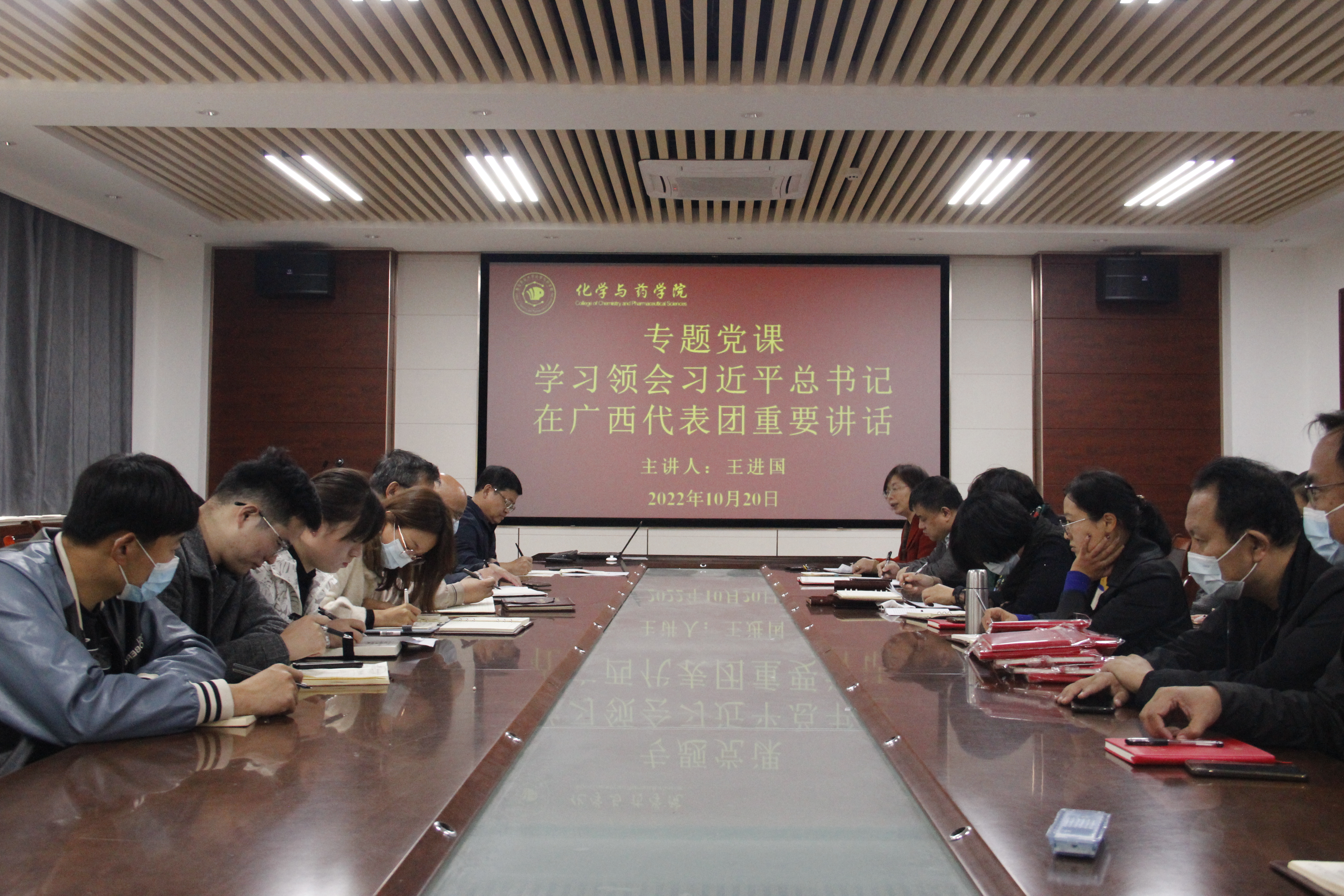 10月20日,太阳成集团tyc122ccvip于化学楼会议室开展专题党课,学习领会习近平总书记在广西代表团重要讲话。党委书记王进国主持,院长龚良玉、党委副书记张友民、党委专职组织员吕海涛、副院长徐鲁斌出席,学院全体党员干部教师参加。