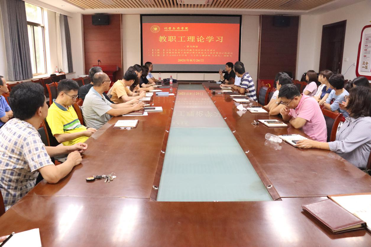 8月26日,太阳成集团tyc122ccvip于化学楼会议室开展教职工理论学习。会议由学院党委书记王进国主持,院长龚良玉、党委副书记史雪辉、党委专职组织员吕海涛、副院长郝双红出席,全体教职工参加。