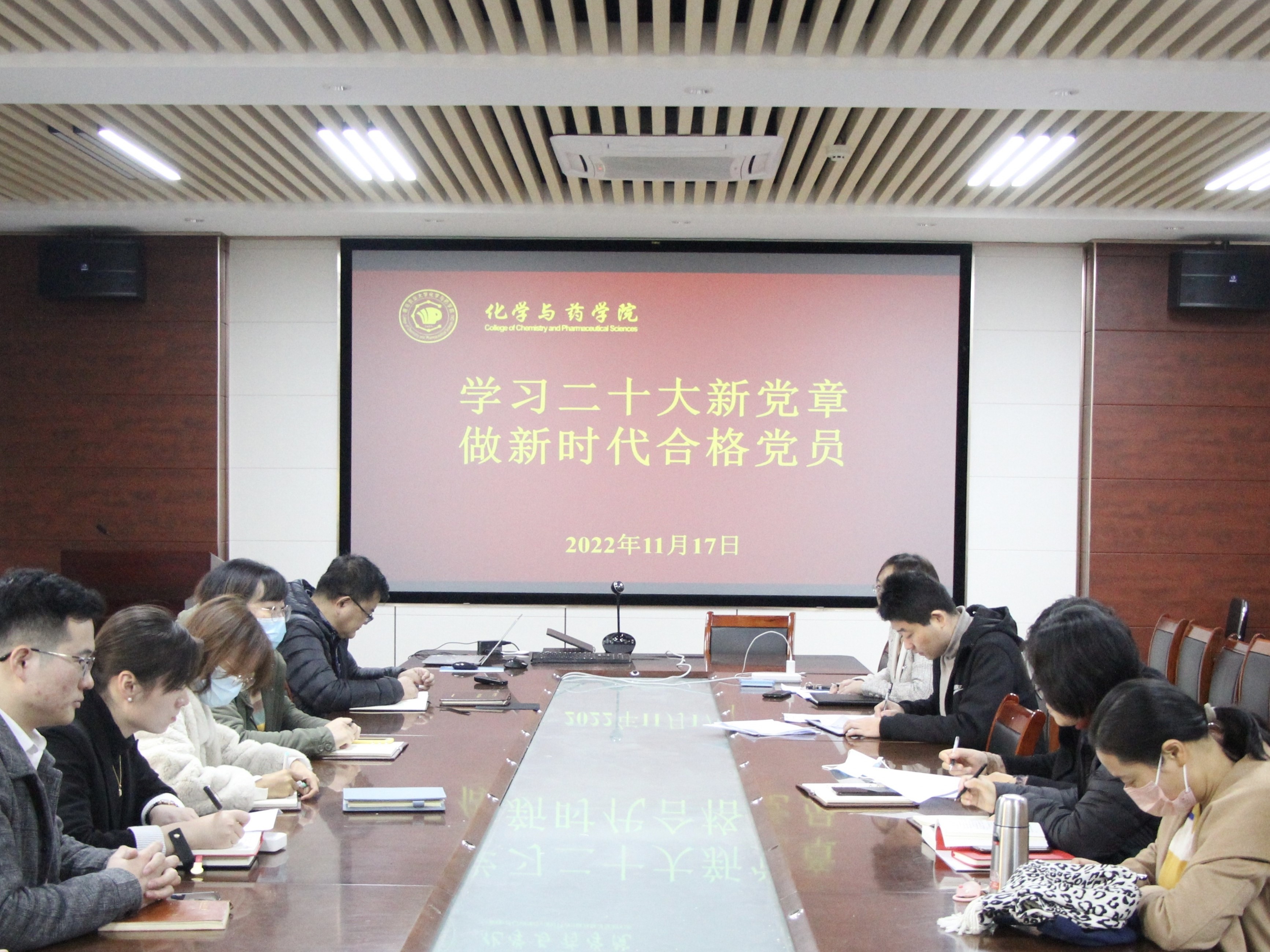 11月17日,太阳成集团tyc122ccvip于化学楼会议室开展“学习二十大新党章,做新时代合格党员”专题理论学习。学院党委专职组织员吕海涛主持会议,全体教职工参加。