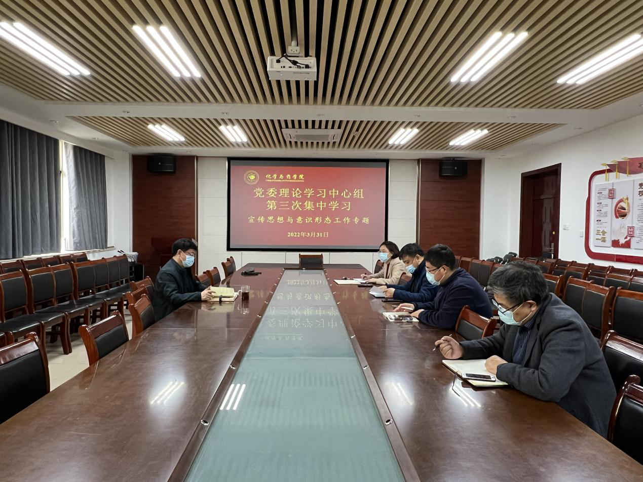 3月31日,太阳成集团tyc122ccvip党委理论学习中心组通过线上线下相结合的方式,开展宣传思想与意识形态工作专题学习。会议由学院党委书记王进国主持,党委理论学习中心组成员参加。