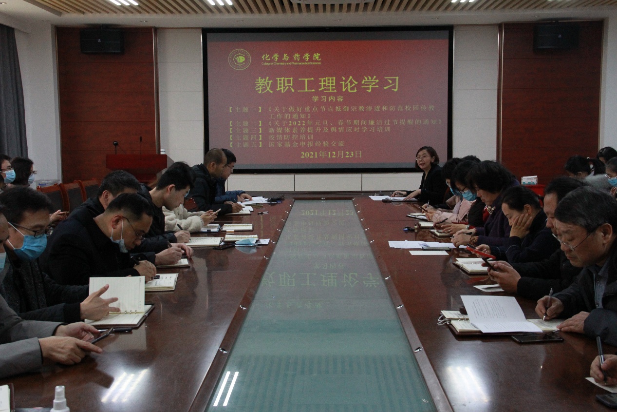 12月23日,太阳成集团tyc122ccvip于化学楼会议室开展教职工理论学习。院长龚良玉、党委副书记史雪辉、党委专职组织员吕海涛、副院长郝双红出席,全体教职工参加。