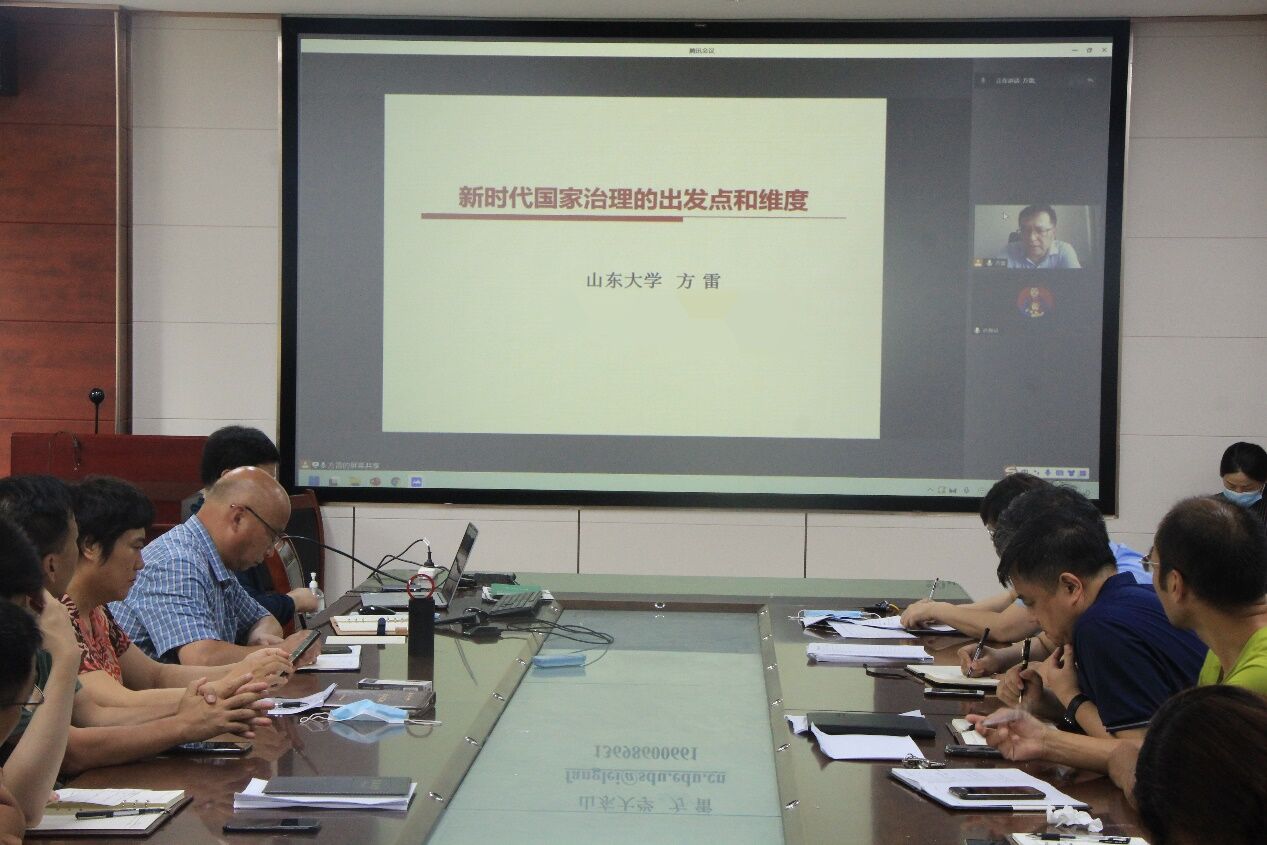 会上,方雷以“新时代国家治理的出发点和纬度”为主题进行宣讲。他从新时代国家治理的出发点、新时代国家治理的维度以及新时代国家治理的路径建构等方面进行了细致解读。方雷通过对比中西方话语体系下治理的不同含义及特点,概括中国国家治理的实质与特性,并从国家发展、治理规则、价值认同三个向度阐述新时代国家治理的具体内涵;并从主客观两方面系统地讲述了新时代国家治理的两大出发点,并从改革开放、世界文明、隐患防范三个维度阐述了对新时代国家治理的思考见解。