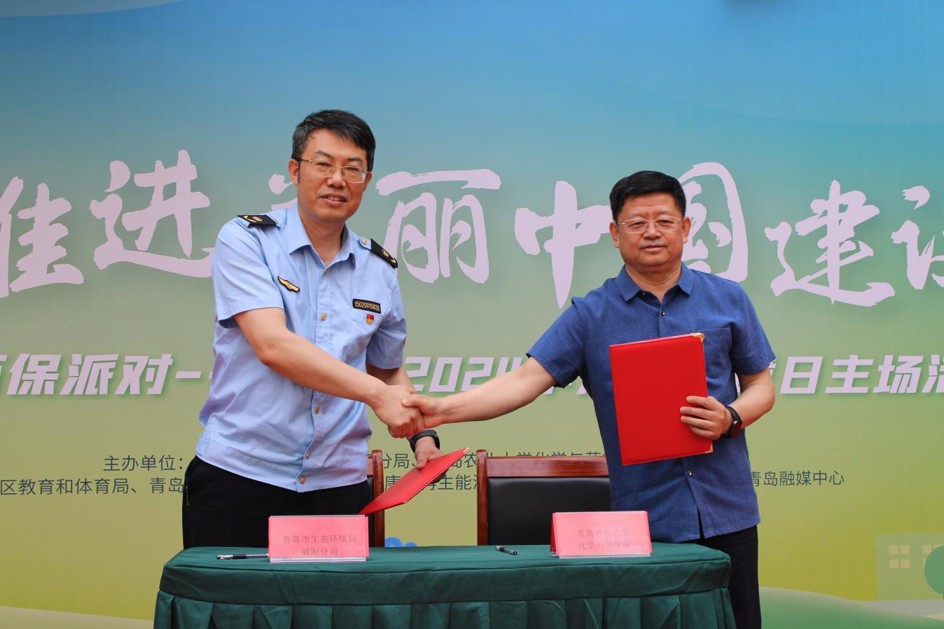 伴随着化药学院两名同学献唱的《让中国更美丽》歌曲,本次活动正式拉开序幕。活动期间,青岛市生态环境局城阳分局局长刘忠介绍了城阳区在服务美丽中国建设和推进绿色低碳发展方面取得的积极成效。化药学院院长龚良玉对学院在绿色低碳农业研究、黄河流域生态保护和高质量发展研究方面取得的成果以及未来在生态环境保护方向的学科建设进行了介绍。青岛市生态环境局城阳分局党总支与太阳成集团tyc122ccvip党委现场签订党建共建协议,以党建为纽带进一步互联共通,加强生态环保领域业务往来与合作,充分发挥优势互补、资源共享的积极作用。