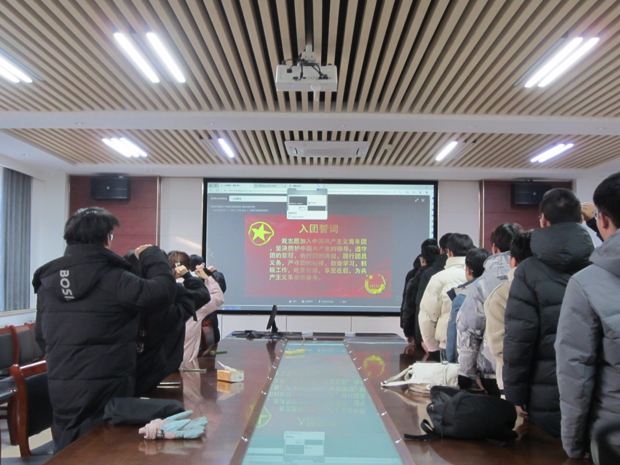 会议伊始,由团支部书记报告团员和青年主题教育开展情况,通报团支部委员会查找不足等情况。随后,会议通过自评、互评、支部认定的方式对团员进行评议。各个团员依次发言,对自己本学期的学习工作表现进行总结,交流经验,开展批评与自我批评,深刻反思自身不足,明确今后努力方向。会议最后,全体团支部委员会成员重温入团誓词。通过重温入团誓词,开展仪式教育,使团员再一次感受到光荣、责任与担当。