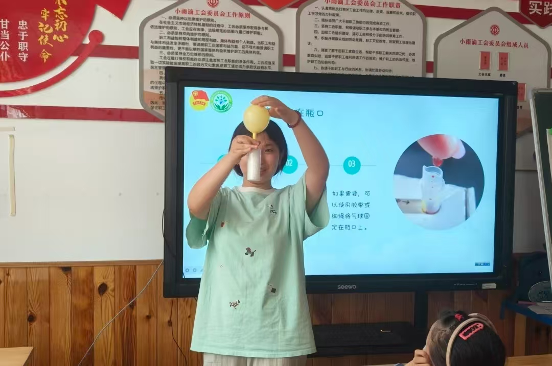 教室里,一场别开生面的化学实验秀引起阵阵惊叹。"快看!瓶子自己吹气球了!"支教团成员王瑜在课堂上演示"瓶子吹气球"实验,小苏打与白醋在瓶中反应,生成大量二氧化碳气体,瞬间吹鼓瓶口气球。孩子们触摸变凉的瓶壁感受吸热现象,用熄灭的火柴验证气体属性。