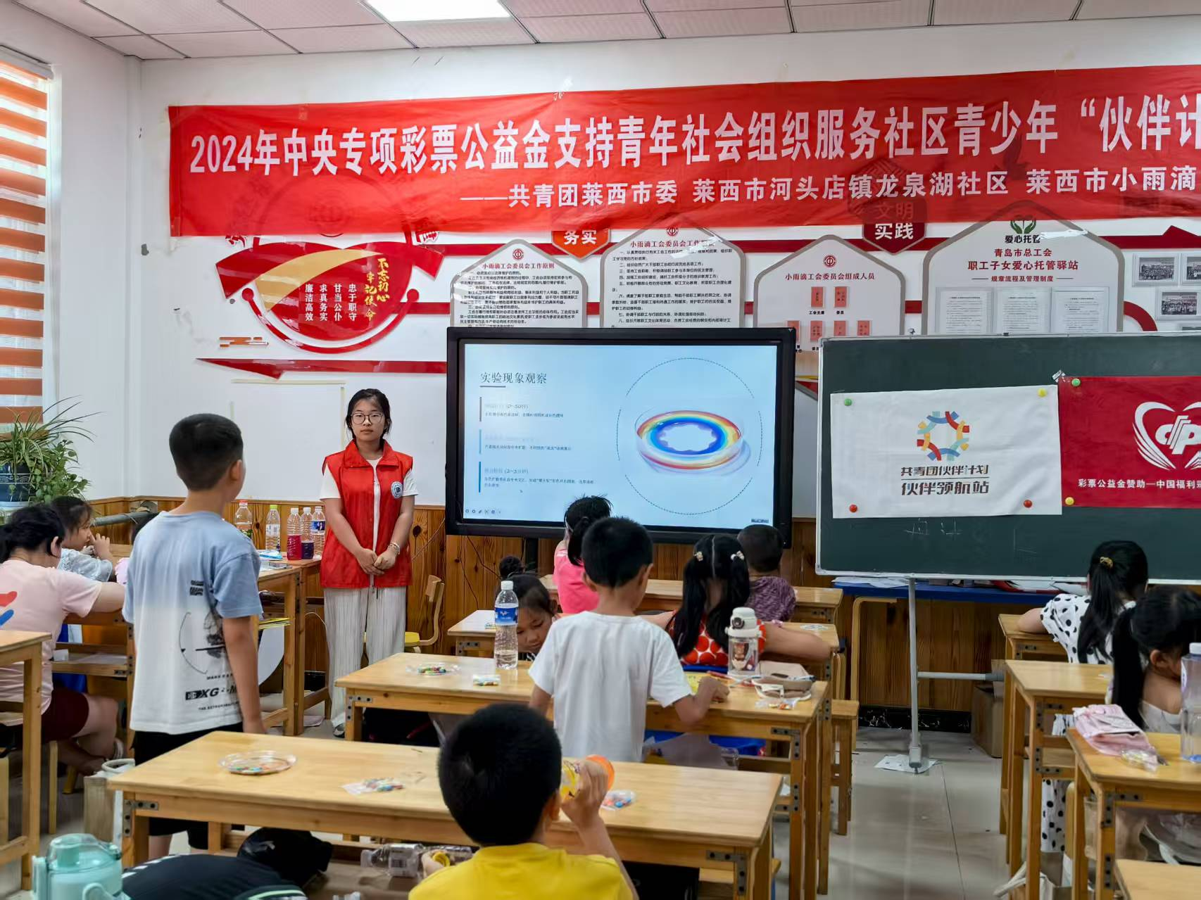图为孩子们做彩虹流星雨实验