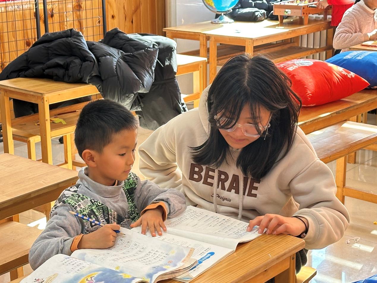 下午课程开始了!小朋友们首先在团队成员们的带领下,完成了本日校内布置的寒假作业。在此期间,团队成员向对题目有困惑的小朋友们进行讲解。答疑解惑时,志愿者们态度端正,耐心引导。他们不仅致力于知识的传授,更注重激发孩子们的学习热情,积极引导他们主动提出问题,培养他们独立思考的能力,以此来推动孩子们相互交流、相互帮助,从而使学习过程更加高效且充满趣味,共同营造出一个温暖、融洽的学习氛围。