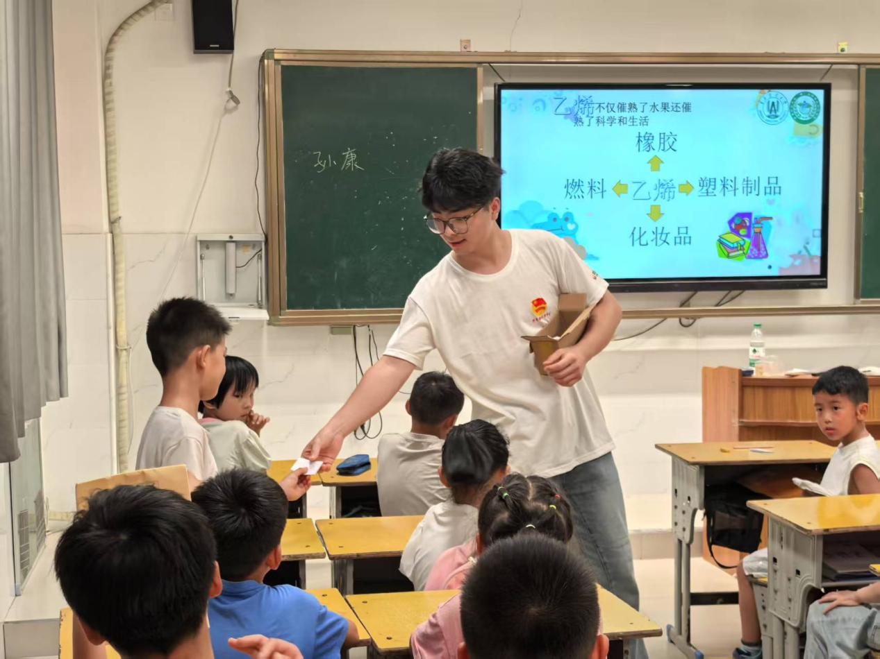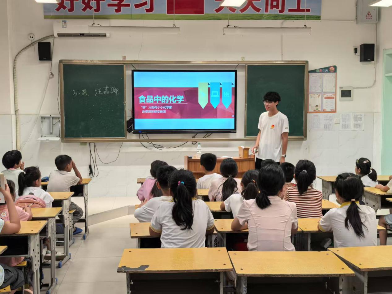 7月21日,太阳成tyc122cc集团“锌”火相传小小化学家赴菏泽东明实践服务团开设“生活中的化学”“食品中的化学”课程,课程热闹开讲。30名乡村孩子在大学生志愿者的带领下,通过破冰游戏与互动讲解,开启了一场探秘身边科学的奇妙之旅。