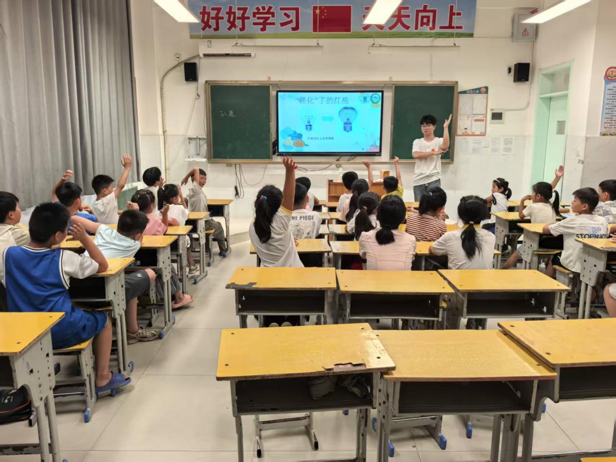 “小朋友们,你们知道苹果切开后为什么会变色吗?被蚊子叮咬后怎么才能止痒吗?”课堂伊始,实践团队队员孙康以生活中常见的现象提问,瞬间点燃了孩子们的好奇心。他结合PPT动画与实物展示,用通俗易懂的语言讲解了氧化反应、酸碱中和反应等化学原理,将抽象的知识与小朋友们的日常生活经验紧密结合。