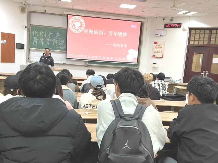 为激发学生创新思维,赋能青年学子将科研探索与创新实践相结合,4月14日下午,第二场“化创未来·青年先锋说”宣讲活动于教学楼B203成功举办,本场活动邀请到材料化学2101班张晶、材料化学2102班张峥和材料化学2102班于超杰三位优秀学生代表,分享各自独到的创新创业与考研备考经验。内容充实,贴近实际。