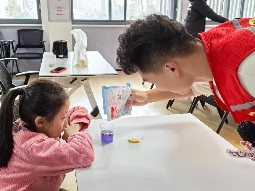 课堂伊始,蝶豆花化学实验科普课上,在实验讲解环节,实践队员利用热门动画片为切入点,选取有关片段,寓教于乐地随着动画片的播放讲解传授与之相关的化学知识,成功吸引到了孩子们的目光。而后在实验实操环节,孩子们观看了蝶豆花水先与柠檬,再与小苏打之间先后发生的酸碱反应和还原反应带来的奇妙变化,让他们充分感受到了化学世界的独特魅力。直观体验极大地激发了他们探索生活中常见的化学反应的热情与了解隐藏其背后的化学知识的好奇心。