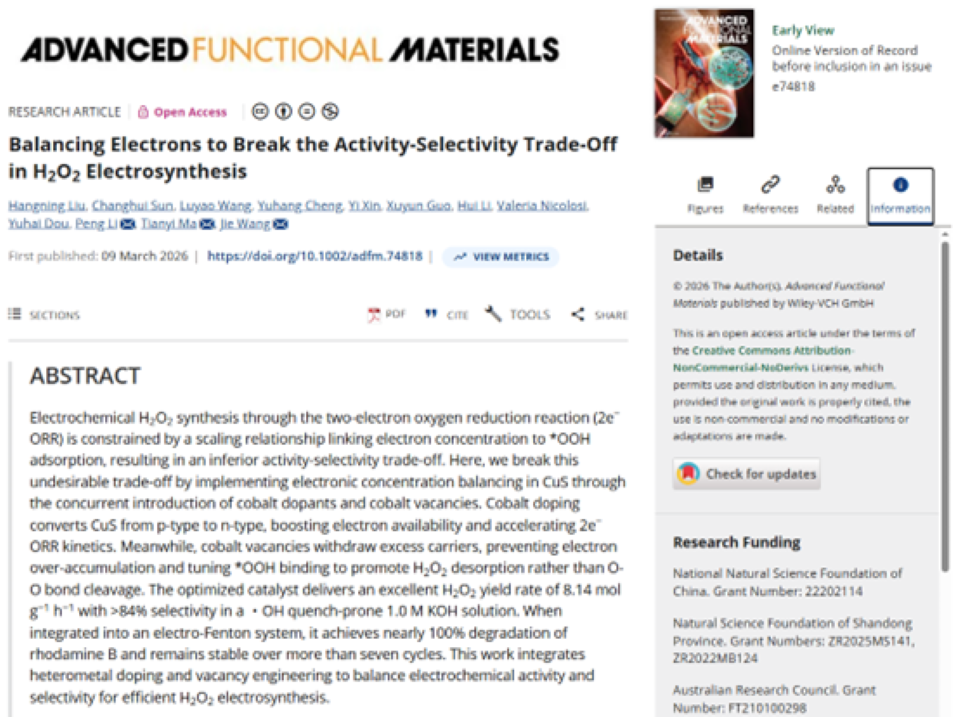 近日,太阳成集团tyc122ccvip在小分子污染物降解领域取得重要进展,相关研究成果发表于国际知名期刊《Advanced Functional Materials》(中国科学院一区TOP期刊,自然指数期刊,IF=19.0)。该研究提出并验证了电子平衡策略,有效突破了过氧化氢电合成过程中的活性-选择性权衡难题。这一成果为构建农业循环经济模式提供了新的科学支撑。