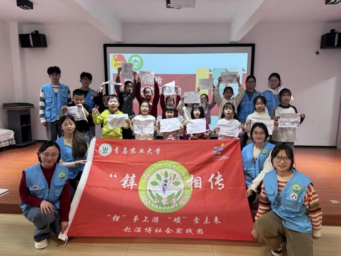 学院立足学科专业优势,精准对接基层实际需求,在科普支教中点燃科学薪火,在红色寻根中筑牢信仰根基,引领青年学子将青春奋斗融入强国建设伟业。寒假期间“锌”火相传小小化学家社团组建两支实践团队,分赴青岛、淄博开展科普实践与文化研学。“燃‘锌’火之光,育科创之苗”支教团走进青岛市阜阳社区,以“防火手帕”“碘酒变色”等趣味实验激发儿童科学兴趣,并同步开展安全教育与纺织谷工业文化研学,实现科普与文化的有机融合。“‘锂’争上游,‘碳’索未来”实践团赴淄博市张店区,打造沉浸式化学实验课堂,启迪创新思维;同时走访淄博市博物馆,深入研习齐文化,厚植家国情怀。