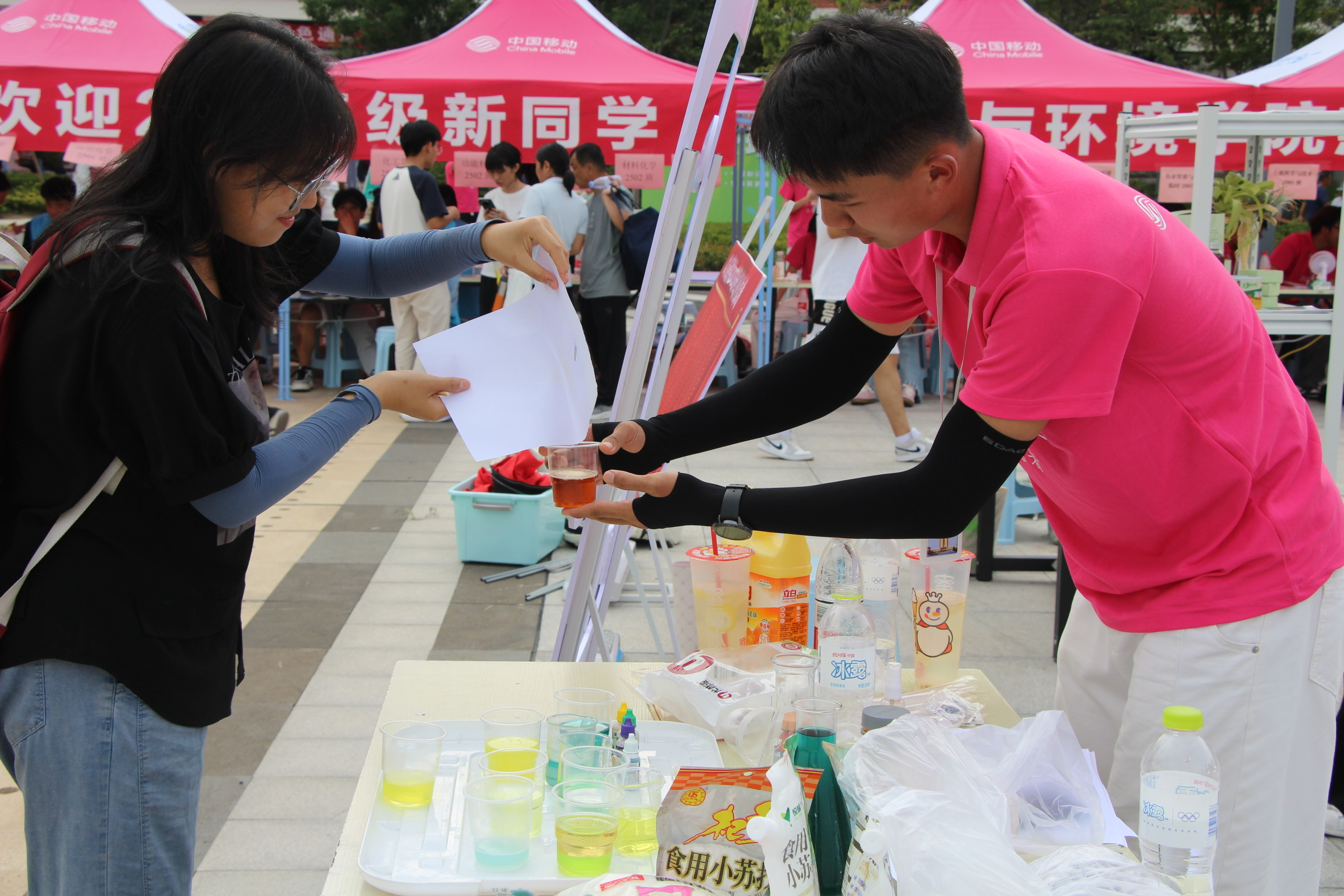 此外,学院统筹各部门力量,周密部署、精心组织,确保新生报到流程顺畅、服务周到,推出“一站式”报到服务模式,各专业报到点秩序井然。从身份信息录入、校园卡发放到新生大礼包领取,各环节衔接顺畅、高效推进。同时,学院在迎新现场还设置专业介绍版、新生拍照打卡点、考研光荣榜及化学科普实验互动区,让新生在入校之初即感受到学科专业魅力。