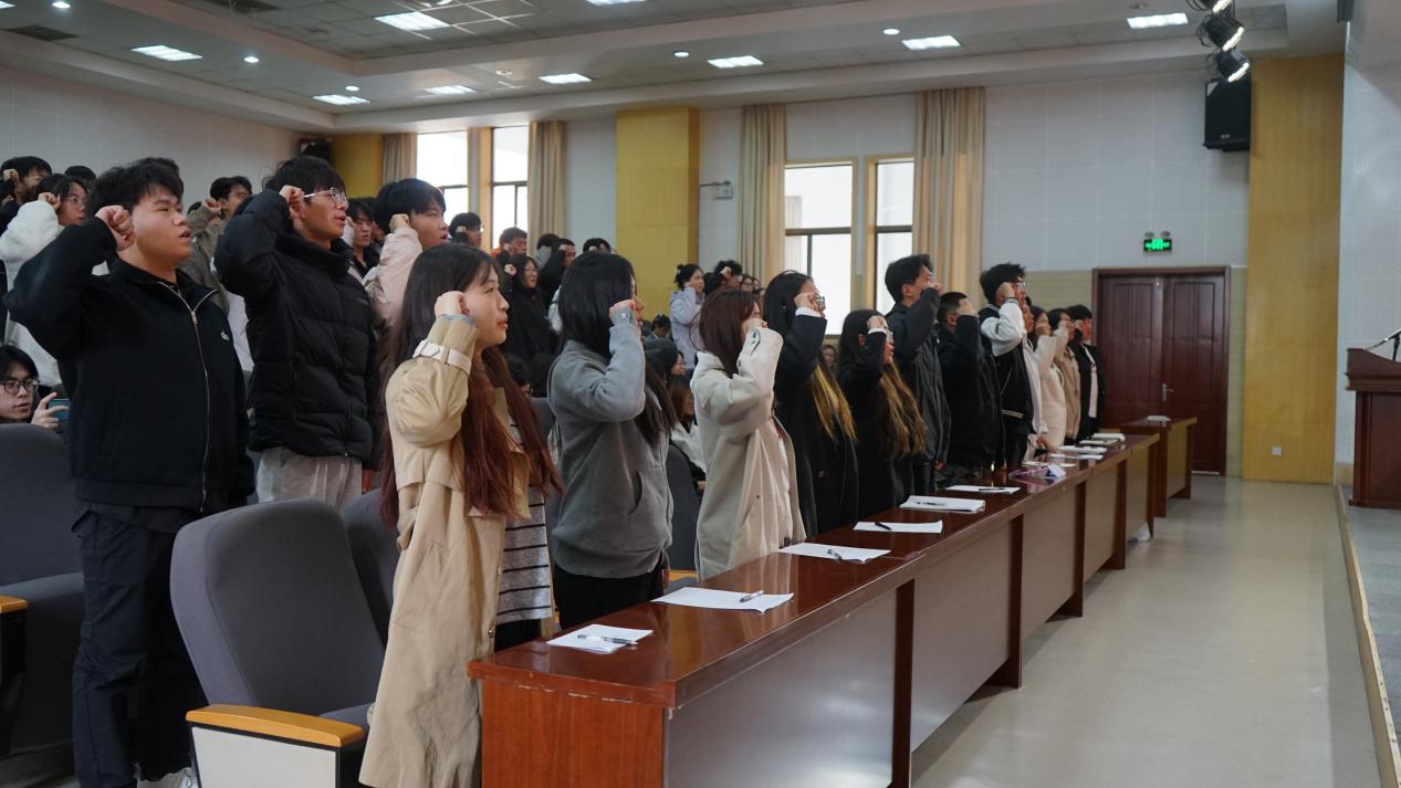 大会在庄严的国歌声中拉开序幕。2024届学生会执行主席郑稳超作工作总结,全面回顾过去一年在思想建设、学风建设、文化活动、社会实践等领域的成果与经验。学院正科级辅导员江守林宣读2025届学生会及学生发展服务中心主要学生干部名单。2025届学生会执行主席张开岩作表态发言,并带领全体2025届成员进行宣誓,承诺将恪尽职守、担当尽责,展现学生干部良好风貌。