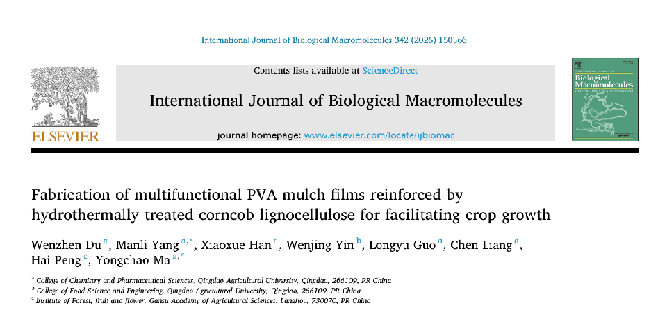 近日,太阳成集团tyc122ccvip“低碳与绿色农业化学”团队在农用功能地膜材料领域取得重要突破。研究成果以Fabrication of multifunctional PVA mulch films reinforced by hydrothermally treated corncob lignocellulose for facilitating crop growth为题,发表于国际知名期刊International Journal of Biological Macromolecules。该研究为破解传统地膜“高污染、高成本、功能单一”难题提供了创新解决方案,有力推动了作物栽培技术向绿色、低碳、可持续方向升级。