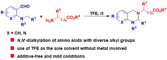 23. Hongjin Shi, Lubin Xu, Didi Ren, Liang Wang,* Weisi Guo and Shuai-Shuai Li*, Fluorinated alcohol mediated N,N’-dialkylation of amino acid derivatives via cascade [1,5]-hydride transfer/cyclization for concise synthesis of tetrahydroquinazoline, Org. Biomol. Chem. 2020, 18, 895-904. (IF = 3.876, 中科院三区)