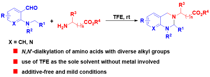 23. Hongjin Shi, Lubin Xu, Didi Ren, Liang Wang,* Weisi Guo and Shuai-Shuai Li*, Fluorinated alcohol mediated N,N’-dialkylation of amino acid derivatives via cascade [1,5]-hydride transfer/cyclization for concise synthesis of tetrahydroquinazoline, Org. Biomol. Chem. 2020, 18, 895-904. (IF = 3.876, 中科院三区)