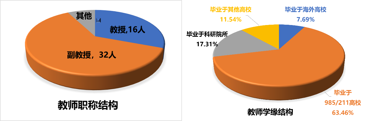 应用化学专业教学团队现为山东省省级教学团队。有专业教师52人,具有正高职称16人,副高职称32人,副高以上职称教师占92.31%;教师中具有博士学位人数比例100%。教师有泰山学者岗位专家1人,泰山学者青年岗位专家2人,山东省有突出贡献的中青年专家1人,山东省教学名师1人,山东省杰出青年基金获得者1人,山东省优青1人,青岛市青年科技专家1人,青岛市教学名师1人,校级教学能手3人。从学缘结构上看,毕业于海外著名大学的有4人,占7.69%,毕业于985、211 重点大学或国家三大重点科研院所教师有42人,占80.77%,如下图所示。