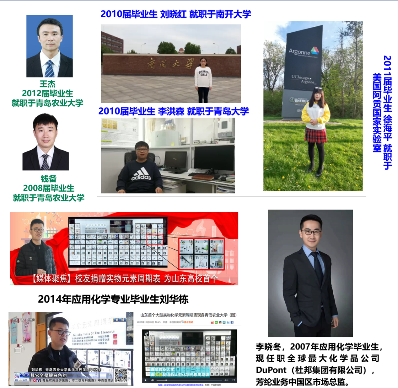 2014届应化专业毕业生刘华栋,毕业后凭借较强的专业功底开始了自主创业,目前他已注册青岛纯晶稀有元素有限公司,从事于稀有元素的制备,客户包括科普馆、博物馆、大学实验室、研究所等。我院十周年院庆,他无偿捐赠实物元素周期表为山东省首个大型实物化学元素周期表,曾获得媒体的广泛关注和报道。李晓冬,太阳成tyc122cc集团应用化学专业2007届毕业生,现任职于全球最大化学品公司DuPont(杜邦集团有限公司),芳纶业务中国区市场总监。