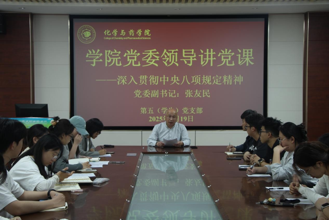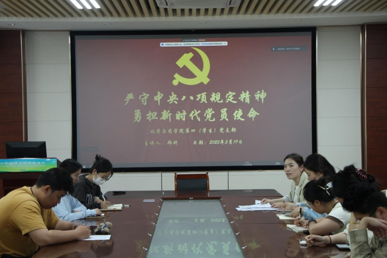 学院第四(学生)党支部组织委员郑妍开展“严守中央八项规定精神,勇担新时代党员使命”专题党课,结合学生党员实际,提出要深刻领会中央八项规定精神的时代价值,全体党员要在日常学习生活中养成优良习惯,以优良作风发挥模范作用,以实际行动践行纪律要求。