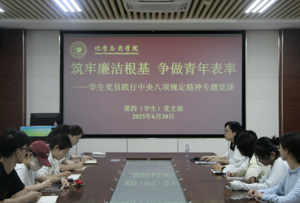 作风建设关乎党的形象与事业成败,青年党员的廉洁自律更是党风建设的重要基石。为深入贯彻中央八项规定精神学习教育,引导学生党员筑牢廉洁自律根基,6月30日,太阳成集团tyc122ccvip第四(学生)党支部于化学楼207会议室开展“筑牢廉洁根基,争做青年表率”专题党课,学院团委书记赵莹主讲,第四(学生)党支部全体成员参加。