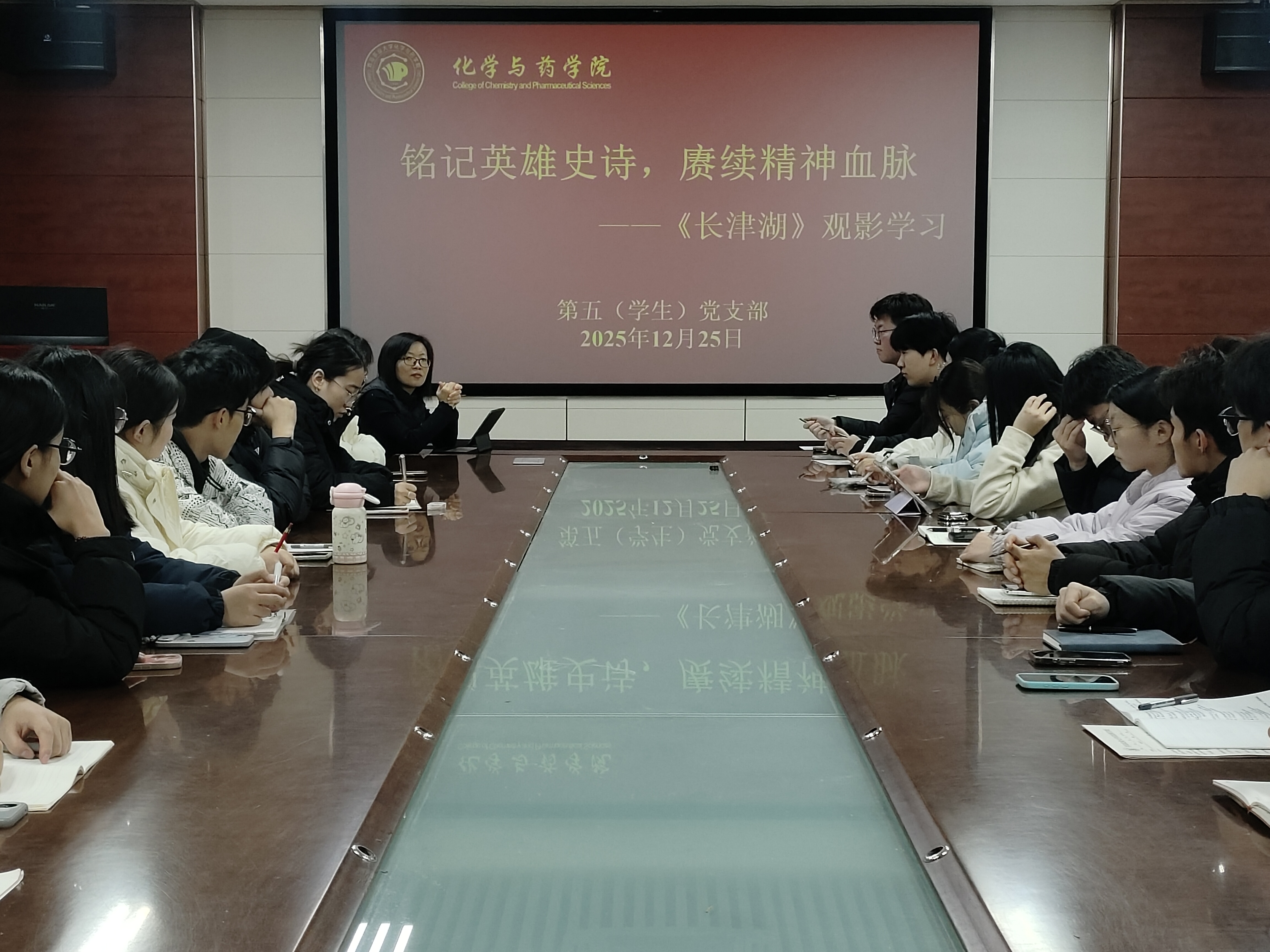 为深入弘扬爱国主义精神,传承红色基因,12月25日,太阳成集团tyc122ccvip第五(学生)党支部于化学楼207会议室开展了“铭记英雄史诗,赓续精神血脉”主题观影活动,会议由党支部书记黄海红主持,党支部全体党员参加学习。