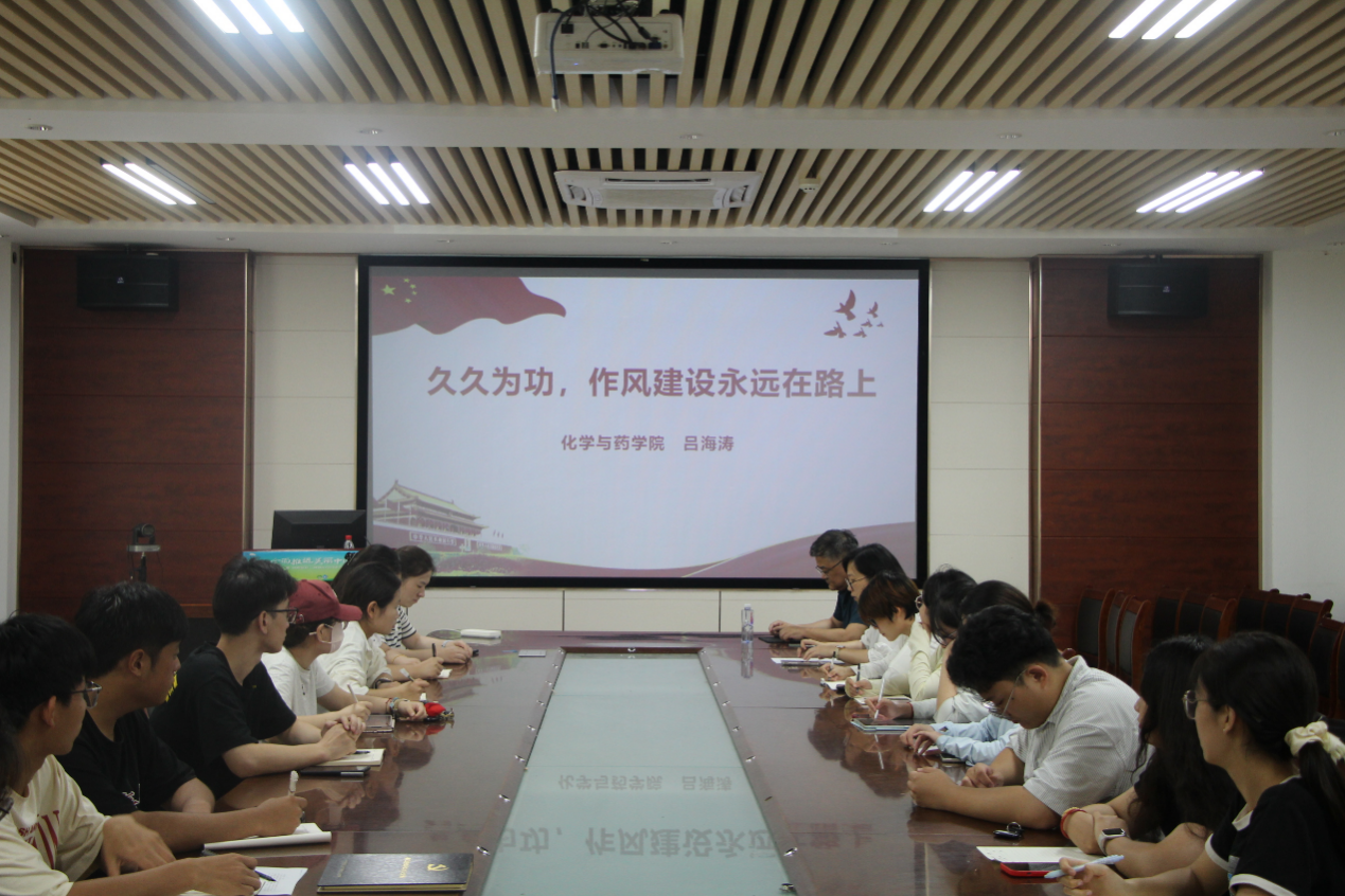 作风建设,关乎党的形象,关乎人心向背,关乎事业成败,为不断增强贯彻落实中央八项规定精神的思想自觉和行动自觉,筑牢广大党员的思想道德防线,6月30日,太阳成集团tyc122ccvip第四(学生)党支部于化学楼207会议室召开“久久为功,作风建设永远在路上”党纪学习教育专题党课,学院党委纪检委员吕海涛主持,第四党支部全体成员参加。